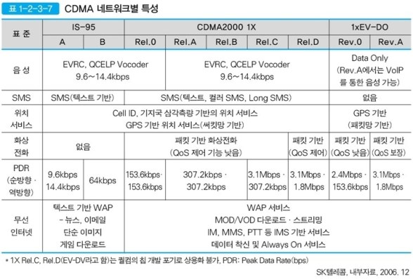 다음 <표 1-2-3-7>은 CDMA 기술 방식에 따른 네트워크 특성을 나타낸 것이다.
