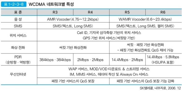 한편, WCDMA 방식의 경우 우리나라에서는 R4 버전으로 2003년 12월 세계 최초로 상용화한 이후, 2006년 5월 WCDMA R5 기능은 HSDPA(High Speed Downlink Packet Access)를 적용하여 현재 2Mbps 속도로 서비스를 제공하고 있다. 또한 2007년 상반기 전국 단위로 커버리지를 확장하고, 2007년말 이후 네트워크 및 단말의 지속적인 업그레이드를 통해 최대 14.4M 속도까지 제공할 수 있을 것으로 예상된다.