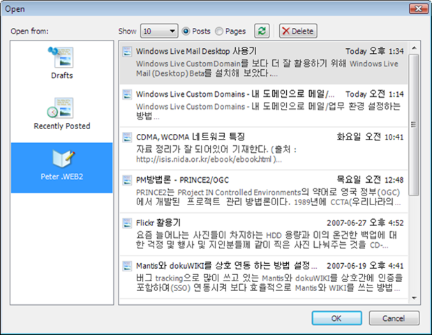 – File > Open을 클릭하면 아래와 같은 화면이 나오는데 원하는 글을 선택하여 “OK”누르면 기존 Post를 수정 가능함.