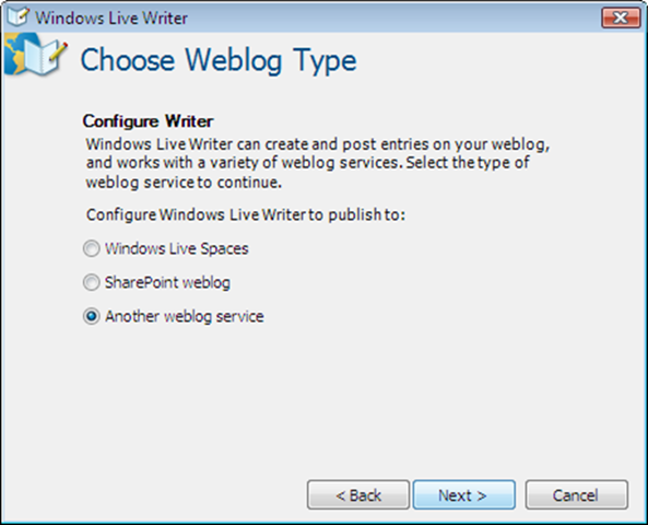 – 여기서는 WordPress.com 이므로 “Another weblog service” 선택 후 “Next” click.
