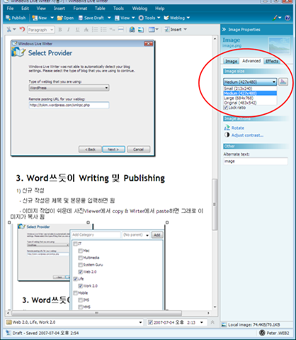평소에 Blogging을 ScribeFire(80%), Blog Site에서 직접 작성(15%), Microsoft Word 2007(5%) 이렇게 작성하고 있었는데 Windows Live Writer 기능이 궁금하여 직접 설치하여 작성해 보았다. 결론은 이미지 첨부 작업이 있는 것은 아주 쉽게 작성하여 Post할 수 있다. (이미지를 자동으로 WordPress에 등록해준다. ) 앞으로 이미지 삽입 작업이 많은 것은 Windows Live Wirter를 써야겠다.