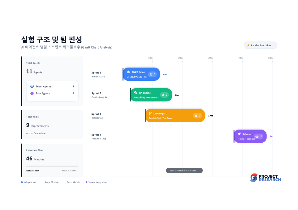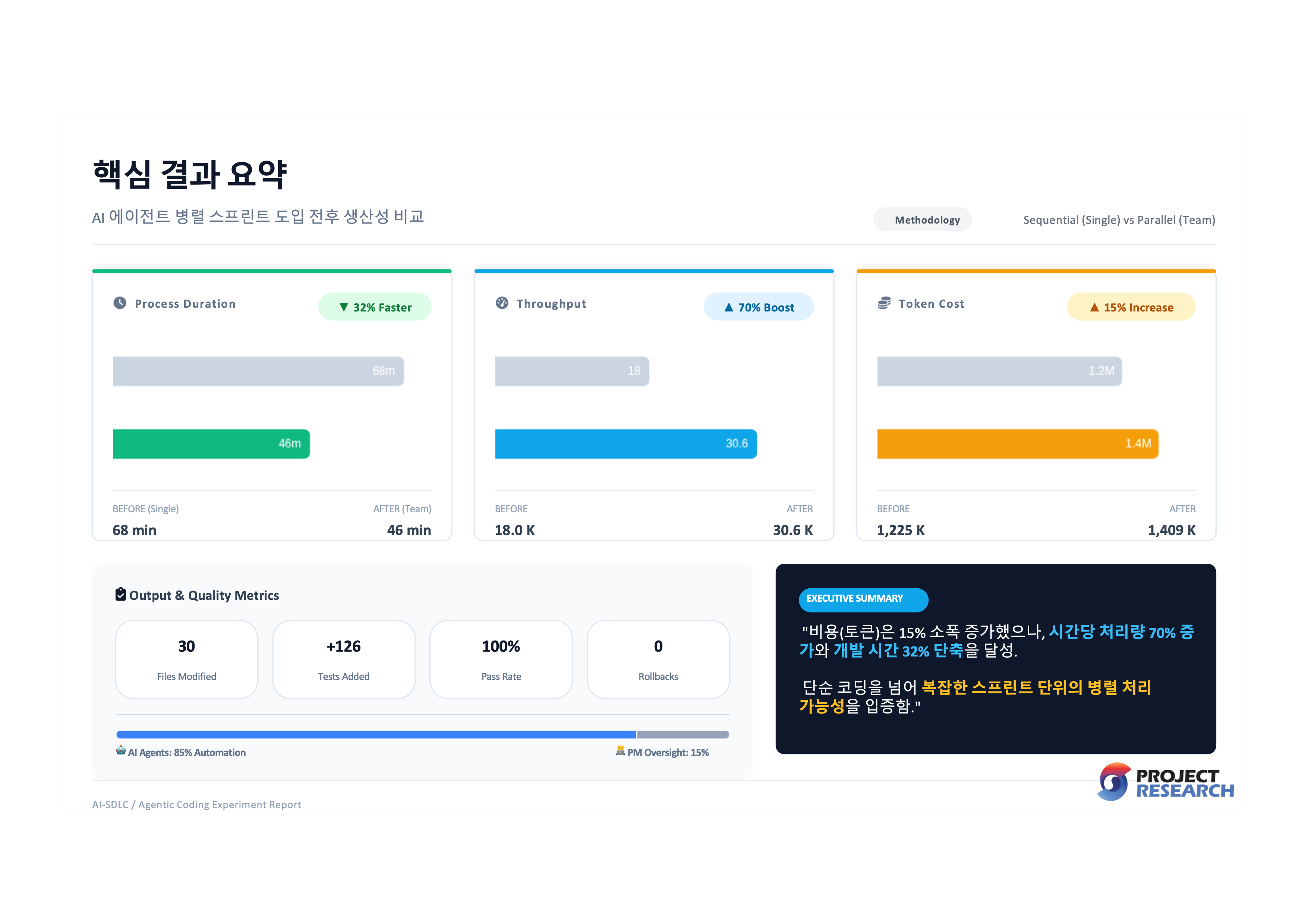 4개 스프린트로 나눠 병렬 실행했습니다. 혼자 하면 68분, 팀 모드로 돌리니 46분. 토큰은 15% 더 썼지만(1,225K→1,409K) 시간은 32% 줄었습니다. 시간당 처리량은 18K→30.6K tokens/분, 70% 증가. 산출물은 30개 파일, +4,339/-1,704 LOC, 테스트 126개 추가. 나는 코드를 한 줄도 치지 않았습니다.
