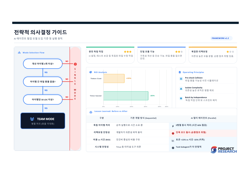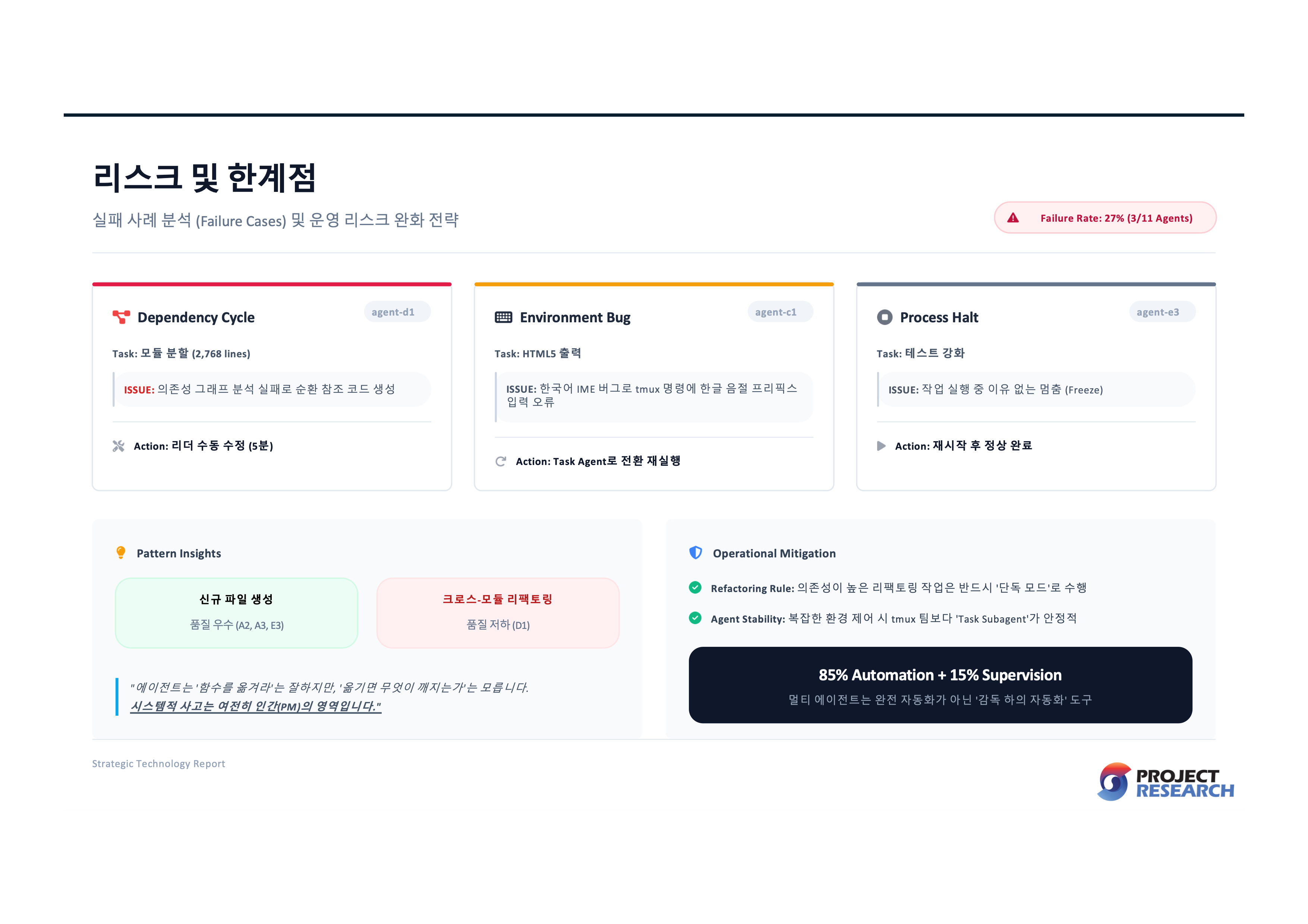 흥미로운 패턴이 보였습니다. 신규 파일 생성(CI 설정, 테스트)은 품질이 높았고, 크로스-모듈 리팩토링은 품질이 낮았습니다. 에이전트는 “함수를 옮겨라”는 잘하지만, “옮기면 뭐가 깨지는가”는 모릅니다. 최종 결과는 1,552 테스트 전체 통과, 롤백 0건. 하지만 멀티 에이전트는 100% 자동화가 아닙니다. 85% 자동화 + 15% 감독. 시스템 사고는 여전히 사람 몫입니다.